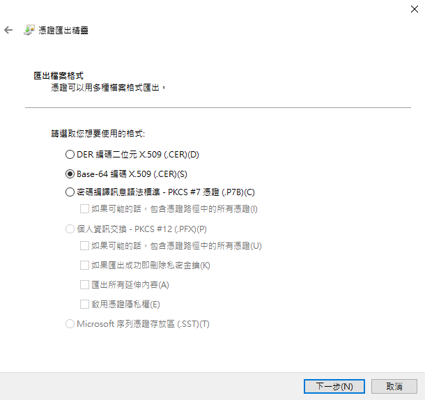• 點選「Base-64 encoded X.509(.CER)」,然後點選「下一步」。