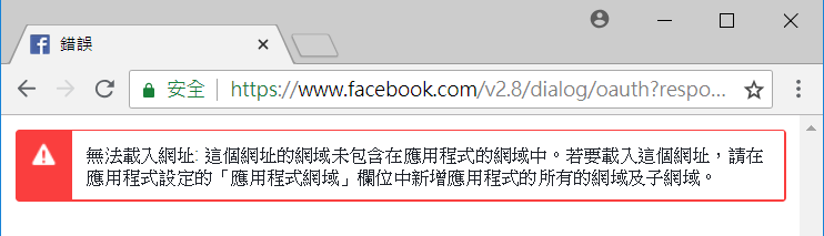 有時候我們網站使用Identity的很大原因,是前端網站要讓使用者可以用Facebook Login,但是最近Facebook實在是改的太兇了,原本很簡易的參數設定就能用,現在卻會出現錯誤:無法載入網址: 這個網址的網域未包含在應用程式的網域中。若要載入這個網址,請在應用程式設定的「應用程式網域」欄位中新增應用程式的所有的網域及子網域。