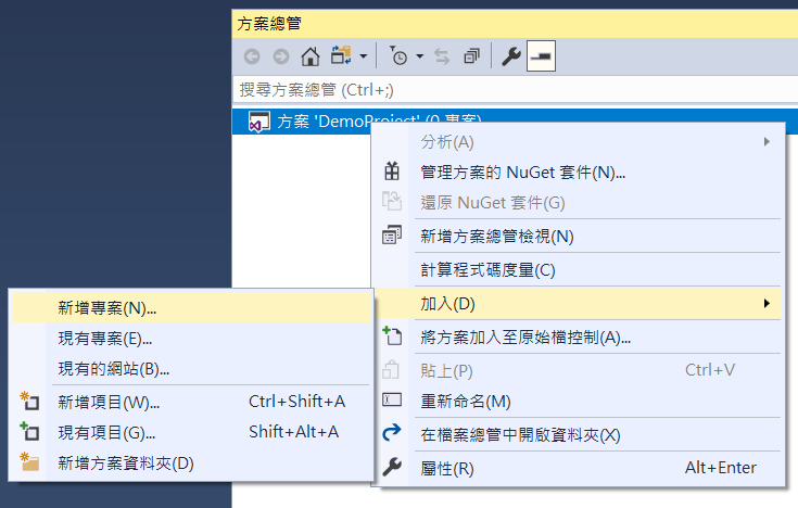 Step08. 在空白方案按下右鍵,選擇加入,然後點「新增專案」