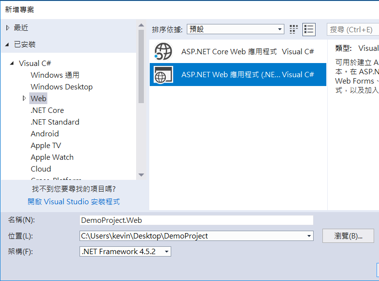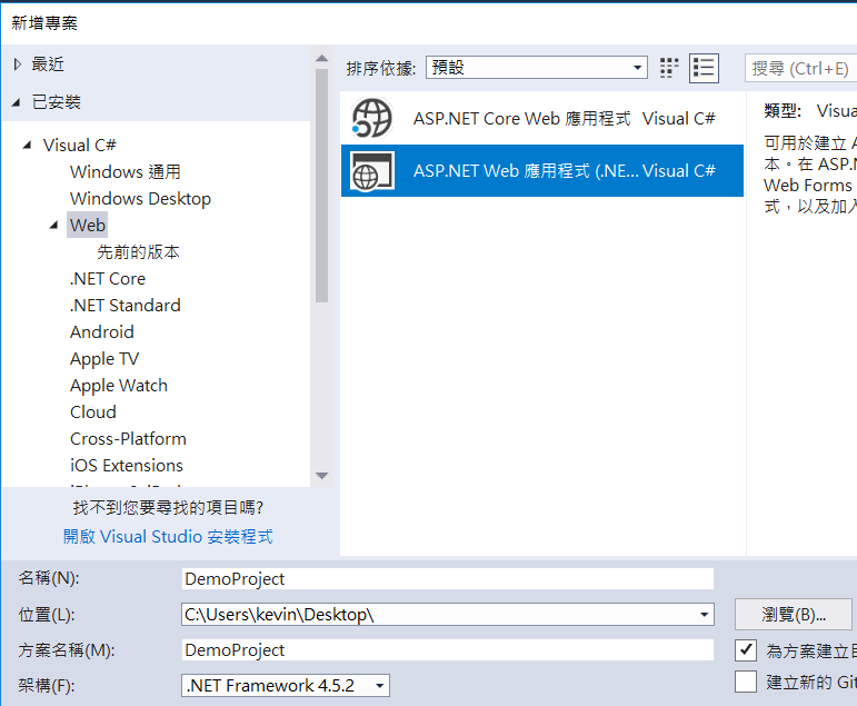 • 選擇 Visual C# 底下 Web 的 ASP.NET Web應用程式(.NET Framework)