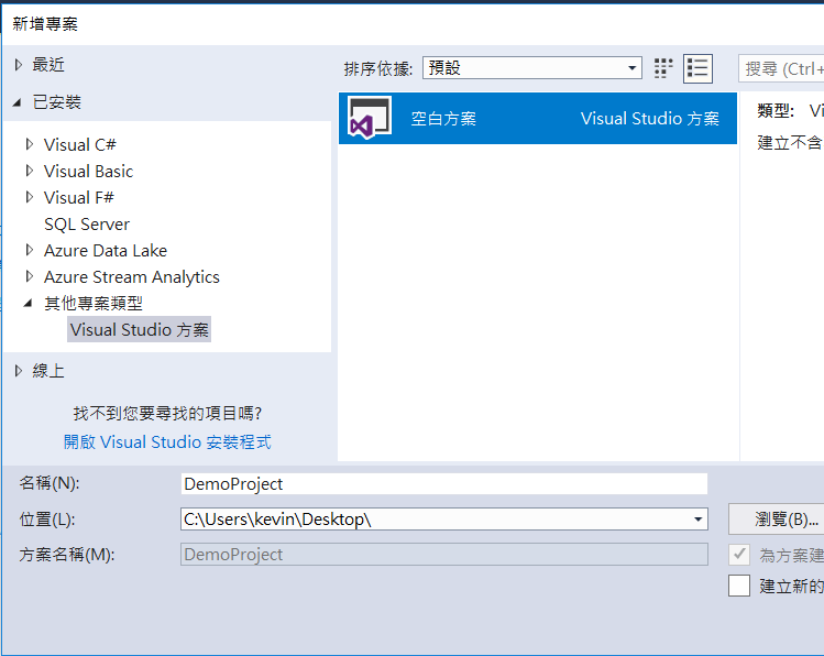 Step06. 在其他專案類型,選擇Visual Studio 方案的空白方案