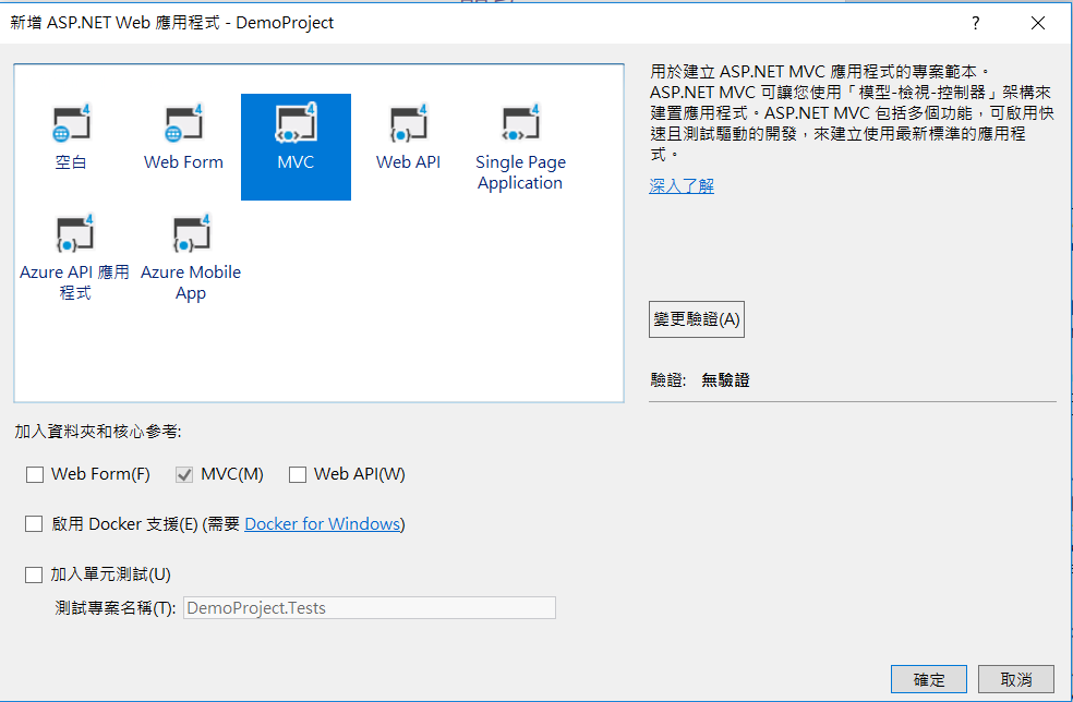 Step03.選擇MVC,驗證:無驗證及按下右下角的「確定」按鈕